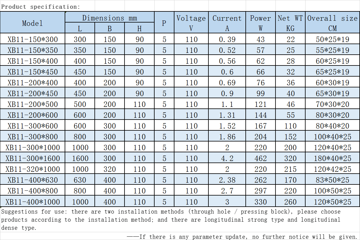 Parameter table of Longitudinal electromagnetic chuck