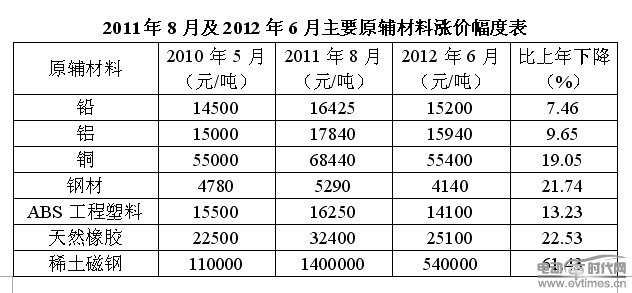 在6月8日剛剛結束的江蘇協會五屆五次理事會議上,江蘇省自行車電動車協會理事長陸金龍指出,雖然不提倡電動車行業的價格戰,但從外部環境看,價格戰的環境已經形成。從去年8月份至今年6月影響電動車成本的鉛、鋁、銅、鋼材價格分別下跌7.46%、9.65%、19.05%、21.74%,ABS工程塑料、天然橡膠價格分別下跌13.23%、22.53%,稀土磁鋼價格下跌61.43%。